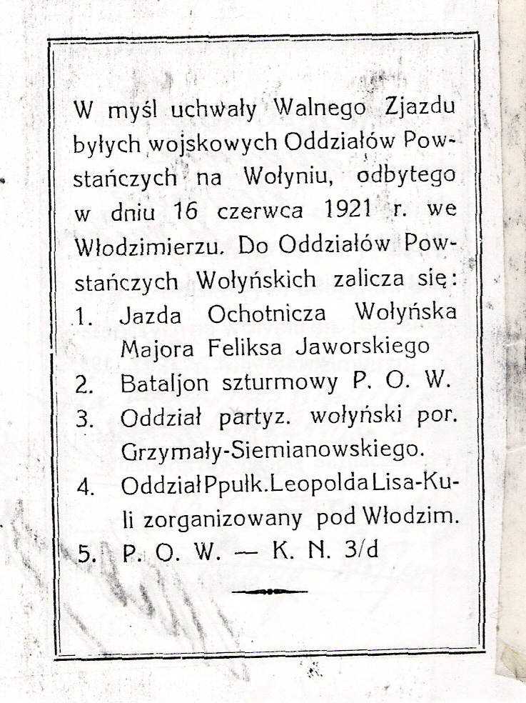 „ W myśl uchwały Walnego Zjazdu byłych wojskowych Oddziałów Powstańczych na Wołyniu, odbytego w dniu 16 czerwca 1921 e. We Włodzimierzu. Do Oddziałów Powstańczych Wołyńskich zalicza się: